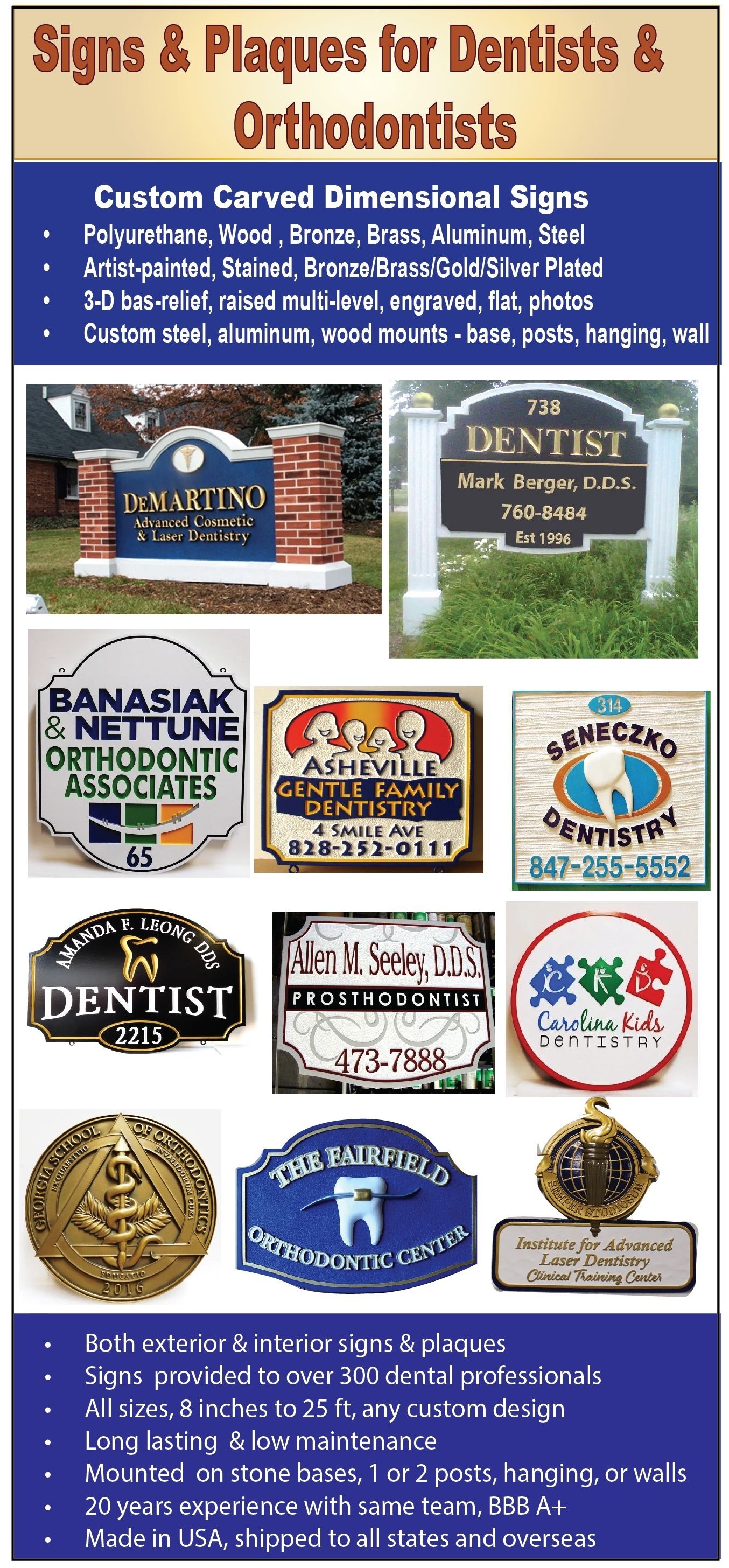 Carved and dimensional wood, high-density-polyurethane (HDU), acrylic, and aluminum signs & plaques for dentists, orthodontists, and other dental professionals.