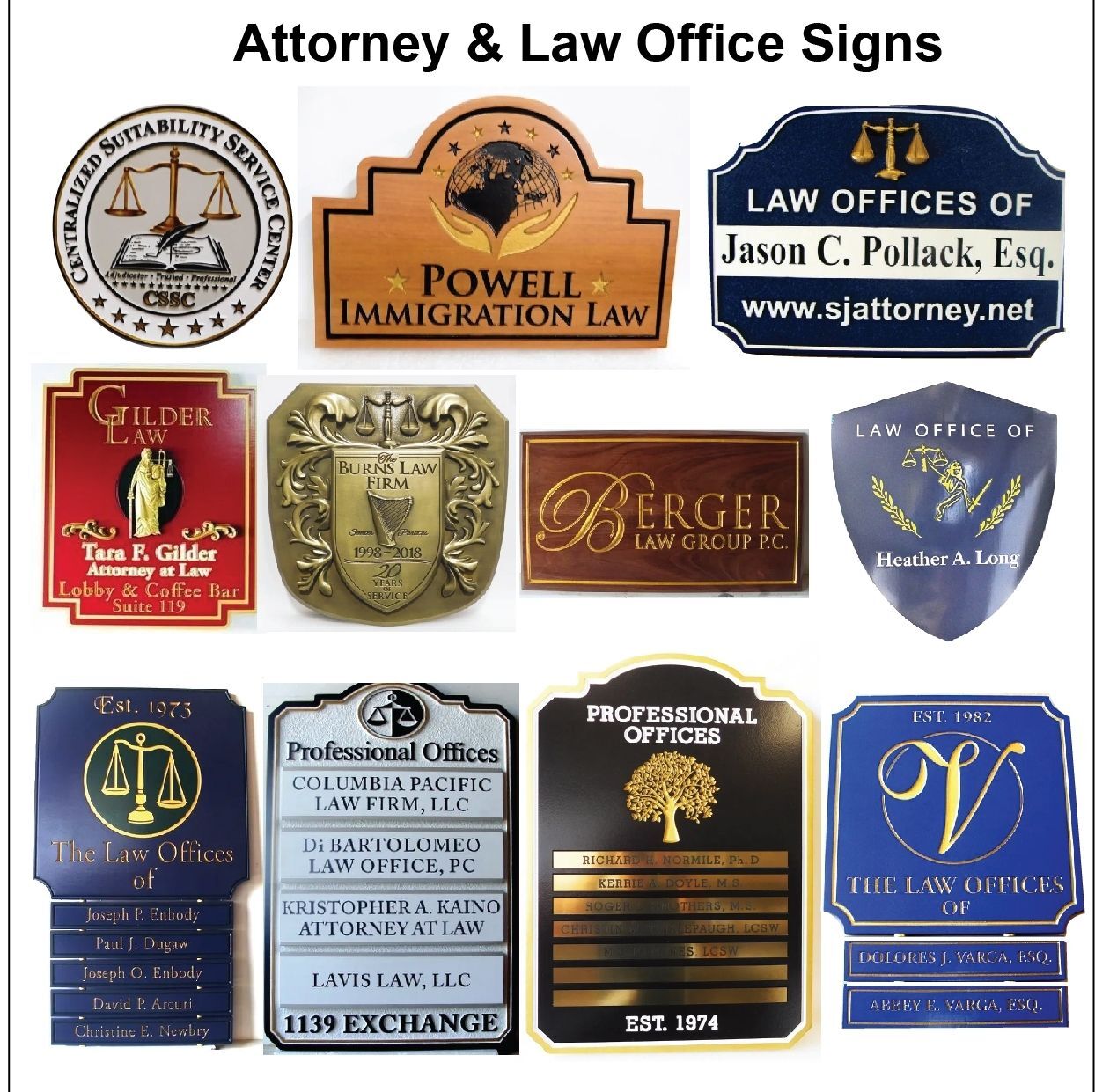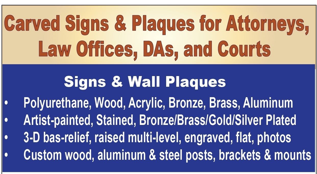 Carved and dimensional wood, high-density-polyurethane (HDU), acrylic, and aluminum signs, shingles & plaques for attorneys and lawyers ; law office directory signs; court and judge seal plaques and signs; Federal, state and district attorney seals and signs; and miscellaneous other law-related signs & plaques.