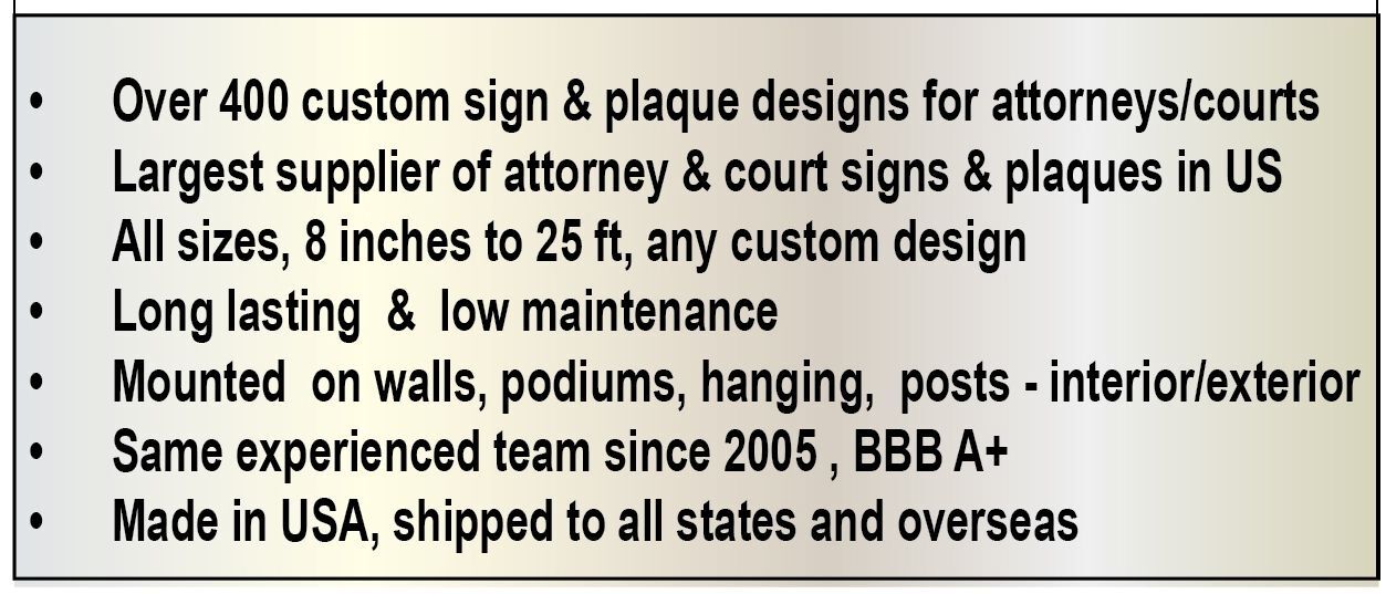 VIEW 200 EXAMPLES OF PHOTOS IN GALLERY 10A ATTORNEY & LAW OFFICE SIGNS & PLAQUES (CLICK ON BLUE BUTTON BELOW)