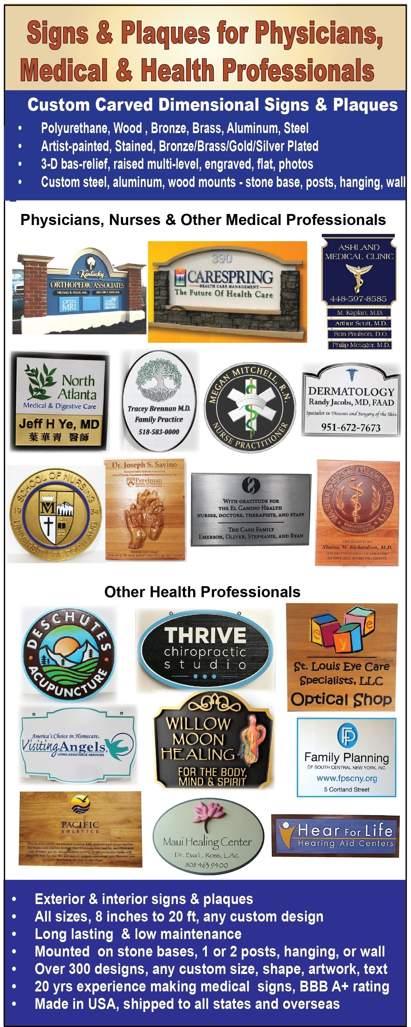 Carved and dimensional wood, high-density-polyurethane (HDU), acrylic,  and aluminum signs & plaques for medical professionals such as physicians, surgeons, nurses, hospitals, medical clinics , and other health professionals just as chiropractors, acupuncturists, physical therapists, counselors and wellness consultants.